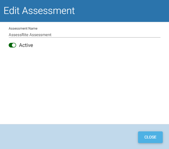 2. You can edit the Assessment Name or change the Active toggle. Any changes you make are reflected in the main Assessment Editor page.