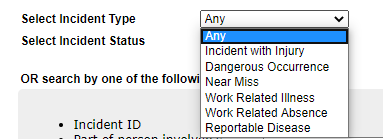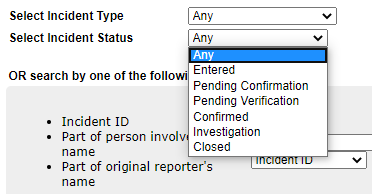 2. Select Incident Status - This is a drop down list of different states of entry and completion for the incident you are searching for.