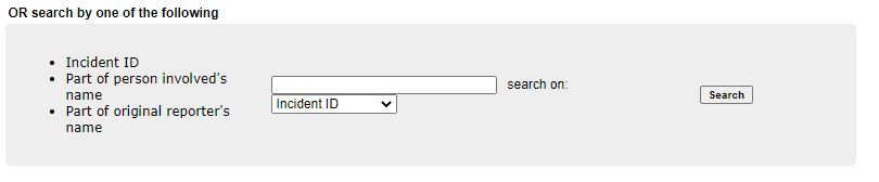 3. OR search by one of the following - This is a text box which will allow you to enter the Incident ID assigned, part of the name of the person involved or part of the name of the original reporter’s name