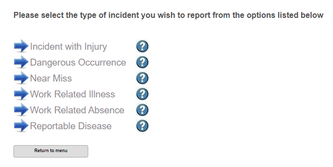 To create a new incident select the ‘Report Incident’ button located at the top right of your main menu screen for AMS. You will then be presented with a bespoke list of types on incident.
