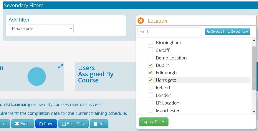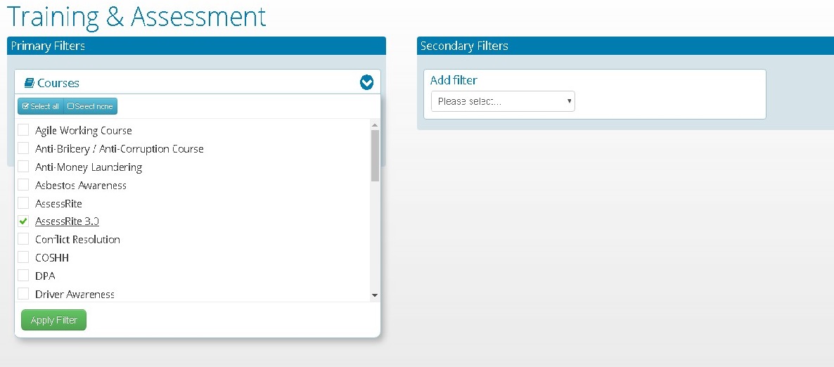 If you require information that is more specific to certain 'Locations, Departments or other Group Types you have on the system, you can use the secondary filter for this. Tick the ones you need the training information on and click 'apply filter'. This information will then load in the Results Table below.