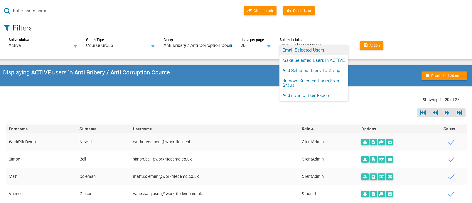 4.The "Action to take" default drop down is "Email selected users" Select "Action" to bring up the Send Email dialogue.