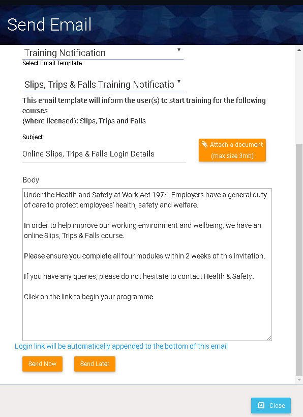 6. It is possible to alter the email subject, body and signature at this point before sending. An attachment can also be included, limited to 3MB in size.