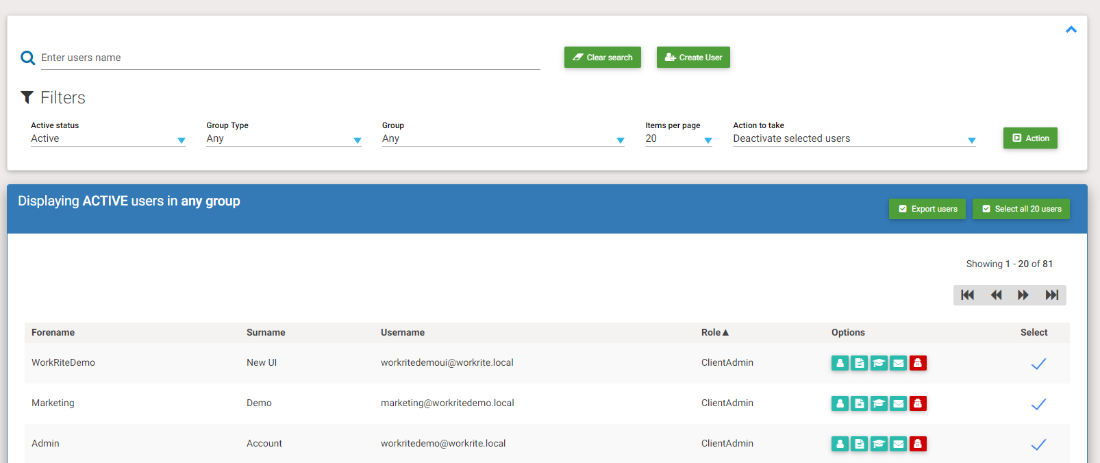 5. From the "Action to take" drop down (in the filer panel) select "Deactivate Selected users" or "Activate Selected user users" then select the "Action" button. The user(s) will now be deactivated or activated accordingly.