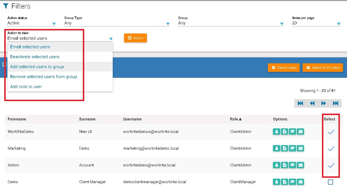 To do this in the reporting system, in either the 'Training & Assessment' report or the 'Users report', you will need to select the users by ticking the boxes on the left side of the results table, then going to the 'action' button.