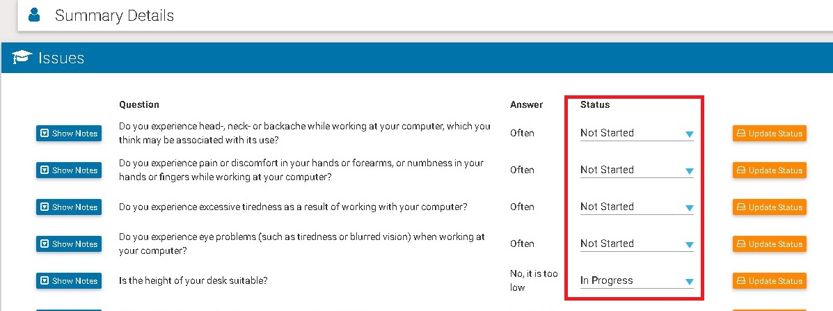 When the issue has 'Not Started' as the 'Status' this means that it is an 'Open Issue'. You can change these to 'Closed' or 'In Progress' from here. Once you have chosen the 'status' the issue requires, click 'update status'