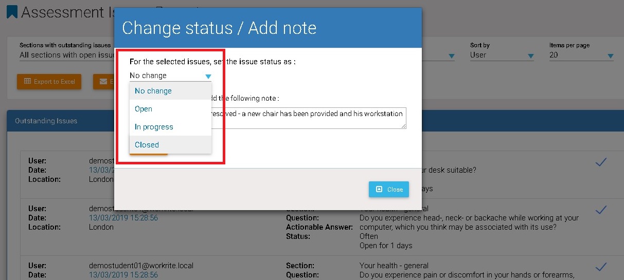The last page will load, where you can change the status of the issue and add a note at the same time. The notes you add will then show on the users training history under the issue in the 'show notes' section on their 'view training' page.