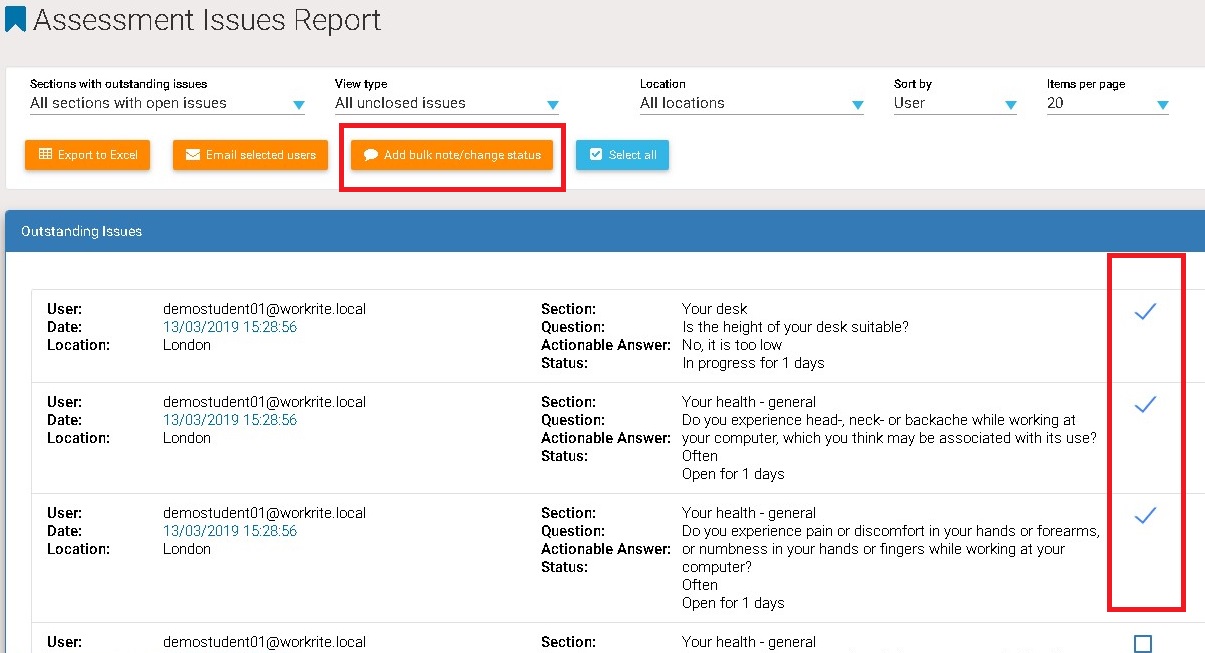 Issues that need to be updated can be selected on the right hand side of the list. Once you have chosen the issues you want to close or update, you will need to press 'Add bulk note/change status'.