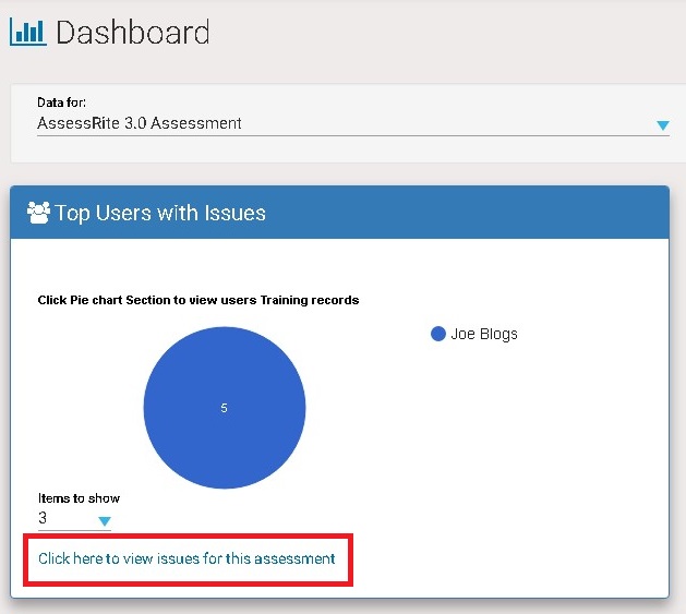 Once you have chosen this, click '...View issues for this assessment' header. The pie chart will show the top users with issues.