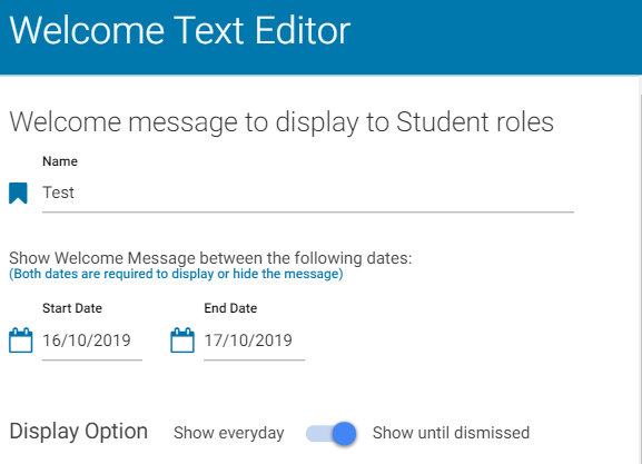 If your Students unable to view the Welcome Message and you wish for them to view this everyday, please make sure that Display Option is set to 'Show everyday'