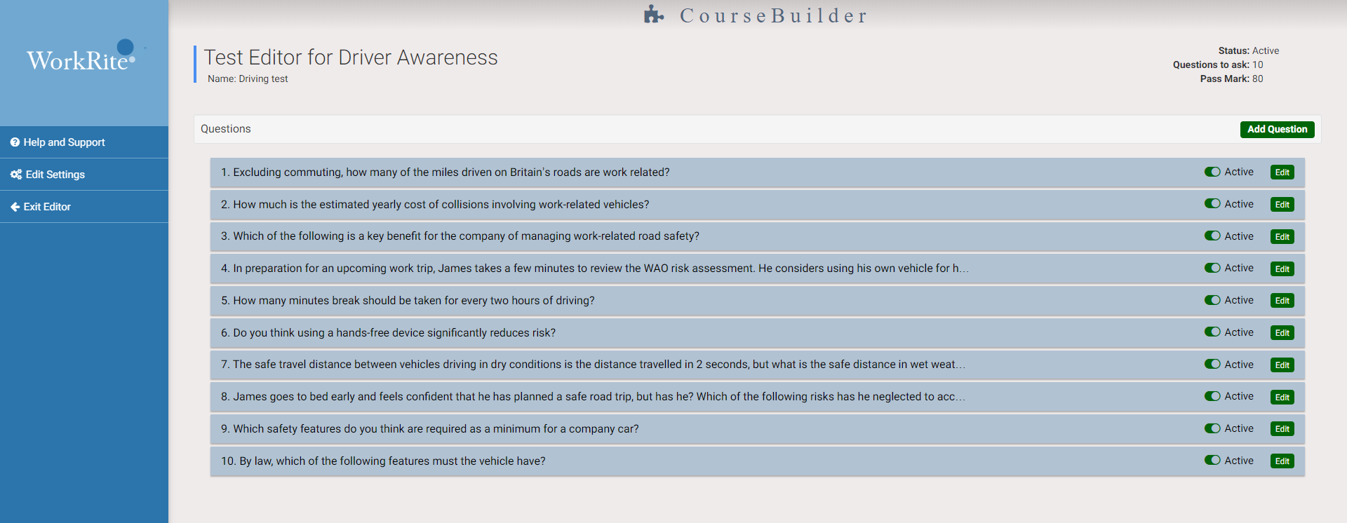 You are on the Test Editor for <Name of course> page. You can see the test details in the top right corner of the screen. This includes: