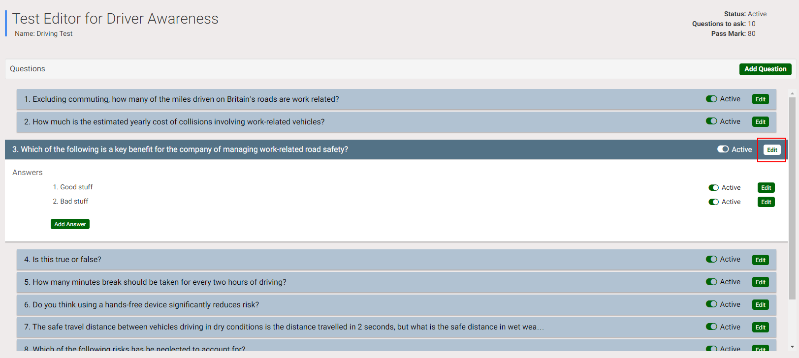 This article assumes that you have created a test and added questions and are in the Test Editor screen. At this point you want to delete existing questions, including their answers.