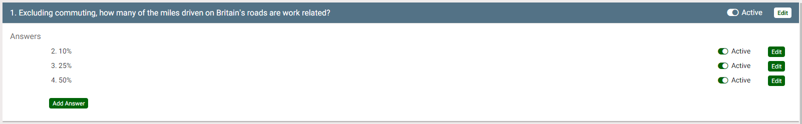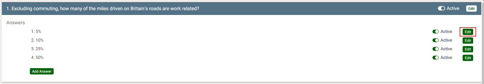 The answers to the question are displayed. Alongside the answers are an Active toggle and an Edit button.